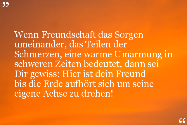 Wenn Freundschaft das Sorgen umeinander, das Teilen der Schmerzen, eine warme Umarmung in schweren Zeiten bedeutet, dann sei Dir gewiss: Hier ist dein Freund bis die Erde aufhört sich um seine eigene Achse zu drehen!
