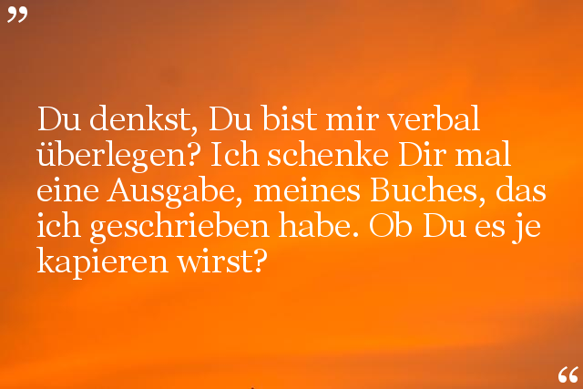 Du denkst, Du bist mir verbal überlegen? Ich schenke Dir mal eine Ausgabe, meines Buches, das ich geschrieben habe. Ob Du es je kapieren wirst?