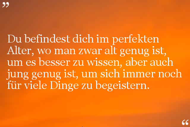 Du befindest dich im perfekten Alter, wo man zwar alt genug ist, um es besser zu wissen, aber auch jung genug ist, um sich immer noch für viele Dinge zu begeistern.