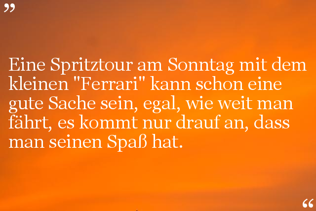 Eine Spritztour am Sonntag mit dem kleinen "Ferrari" kann schon eine gute Sache sein, egal, wie weit man fährt, es kommt nur drauf an, dass man seinen Spaß hat.