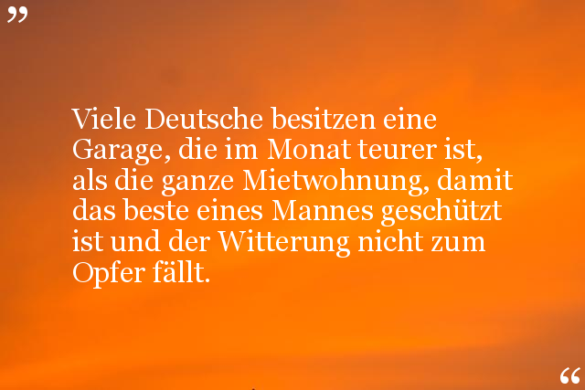 Viele Deutsche besitzen eine Garage, die im Monat teurer ist, als die ganze Mietwohnung, damit das beste eines Mannes geschützt ist und der Witterung nicht zum Opfer fällt.