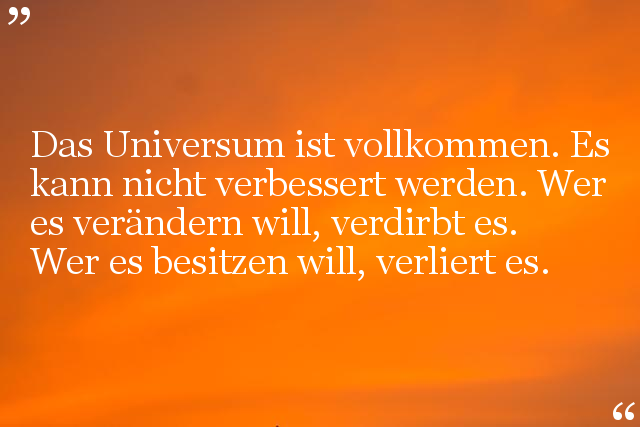 Das Universum ist vollkommen. Es kann nicht verbessert werden. Wer es verändern will, verdirbt es. Wer es besitzen will, verliert es.