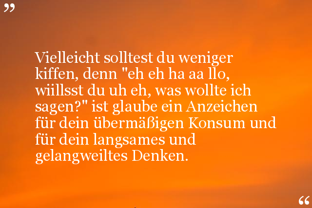 Vielleicht solltest du weniger kiffen, denn "eh eh ha aa llo, wiillsst du uh eh, was wollte ich sagen?" ist glaube ein Anzeichen für dein übermäßigen Konsum und für dein langsames und gelangweiltes Denken.