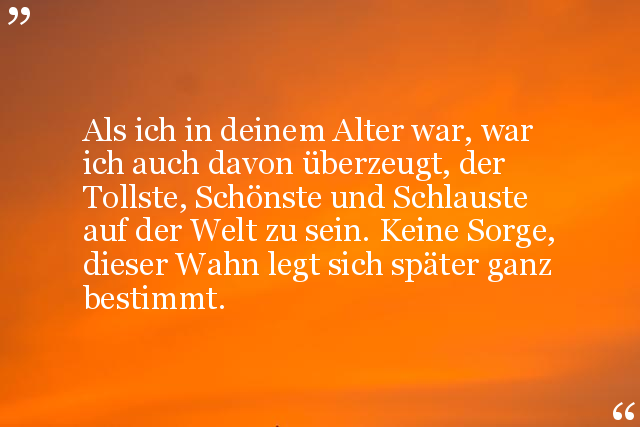 Als ich in deinem Alter war, war ich auch davon überzeugt, der Tollste, Schönste und Schlauste auf der Welt zu sein. Keine Sorge, dieser Wahn legt sich später ganz bestimmt.