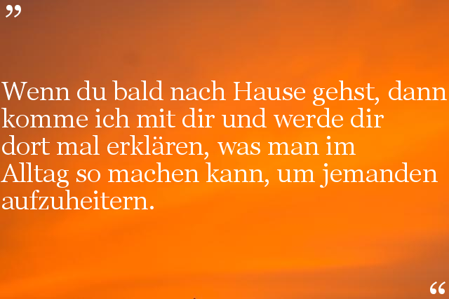 Wenn du bald nach Hause gehst, dann komme ich mit dir und werde dir dort mal erklären, was man im Alltag so machen kann, um jemanden aufzuheitern.