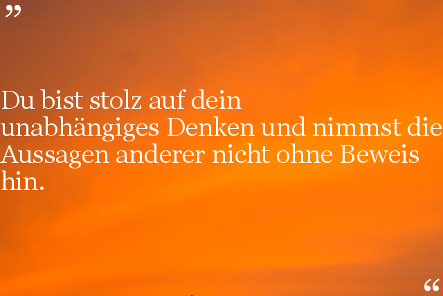 Du bist stolz auf dein unabhängiges Denken und nimmst die Aussagen anderer nicht ohne Beweis hin.