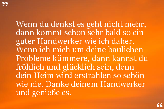 Wenn du denkst es geht nicht mehr, dann kommt schon sehr bald so ein guter Handwerker wie ich daher. Wenn ich mich um deine baulichen Probleme kümmere, dann kannst du fröhlich und glücklich sein, denn dein Heim wird erstrahlen so schön wie nie. Danke deinem Handwerker und genieße es.