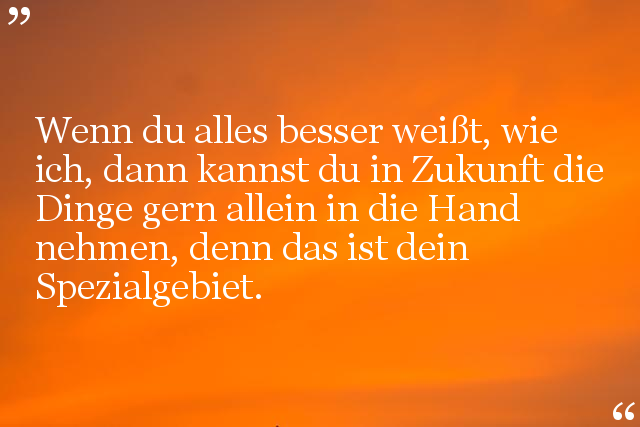 Wenn du alles besser weißt, wie ich, dann kannst du in Zukunft die Dinge gern allein in die Hand nehmen, denn das ist dein Spezialgebiet.