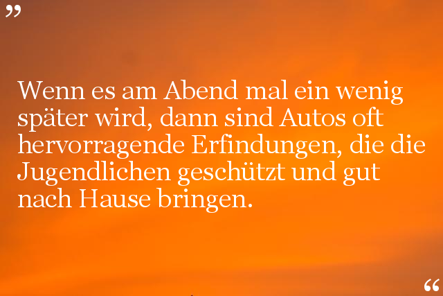 Wenn es am Abend mal ein wenig später wird, dann sind Autos oft hervorragende Erfindungen, die die Jugendlichen geschützt und gut nach Hause bringen.