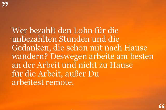 Wer bezahlt den Lohn für die unbezahlten Stunden und die Gedanken, die schon mit nach Hause wandern? Deswegen arbeite am besten an der Arbeit und nicht zu Hause für die Arbeit, außer Du arbeitest remote.