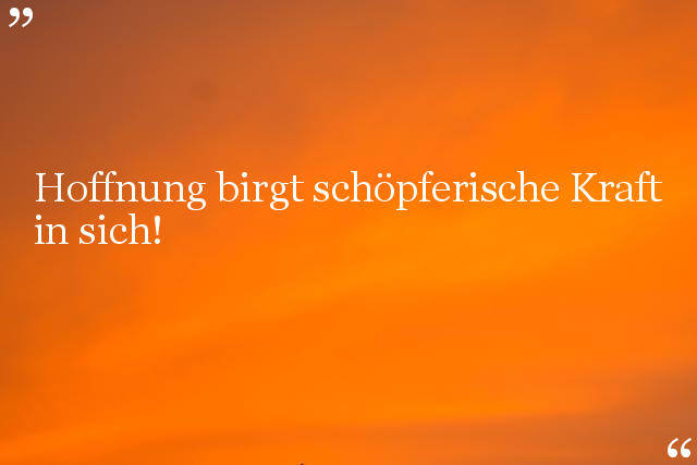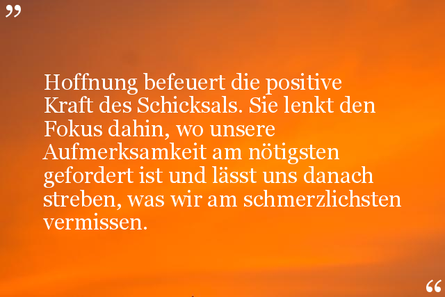 Hoffnung befeuert die positive Kraft des Schicksals. Sie lenkt den Fokus dahin, wo unsere Aufmerksamkeit am nötigsten gefordert ist und lässt uns danach streben, was wir am schmerzlichsten vermissen.