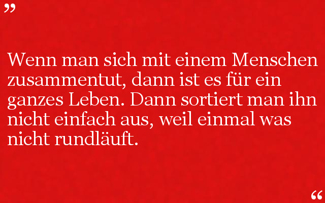 Wenn man sich mit einem Menschen zusammentut, dann ist es für ein ganzes Leben. Dann sortiert man ihn nicht einfach aus, weil einmal was nicht rundläuft.