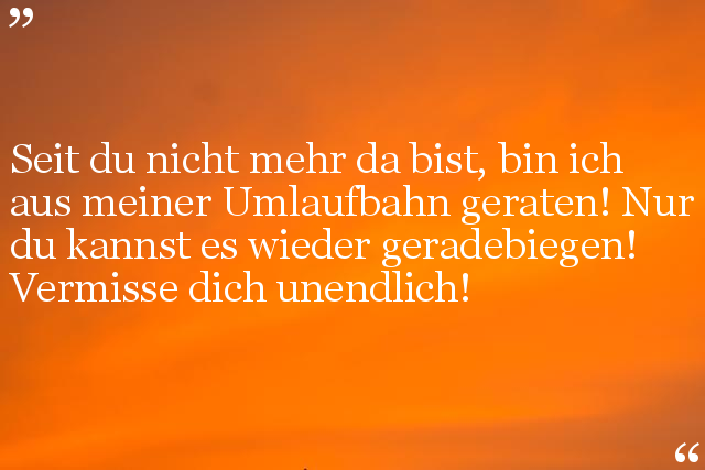 Seit du nicht mehr da bist, bin ich aus meiner Umlaufbahn geraten! Nur du kannst es wieder geradebiegen! Vermisse dich unendlich!