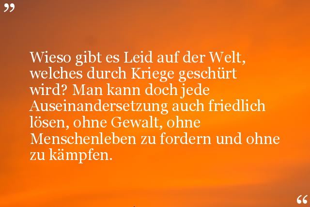 Wieso gibt es Leid auf der Welt, welches durch Kriege geschürt wird? Man kann doch jede Auseinandersetzung auch friedlich lösen, ohne Gewalt, ohne Menschenleben zu fordern und ohne zu kämpfen.