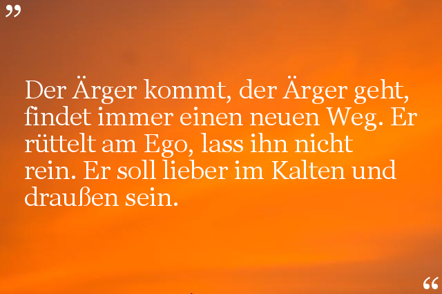 Der Ärger kommt, der Ärger geht, findet immer einen neuen Weg. Er rüttelt am Ego, lass ihn nicht rein. Er soll lieber im Kalten und draußen sein.