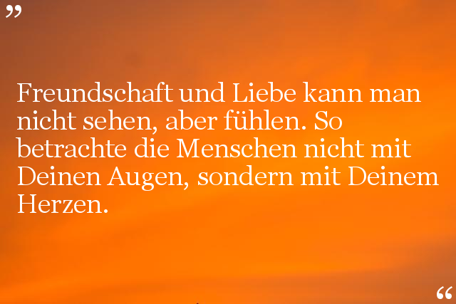 Freundschaft und Liebe kann man nicht sehen, aber fühlen. So betrachte die Menschen nicht mit Deinen Augen, sondern mit Deinem Herzen.