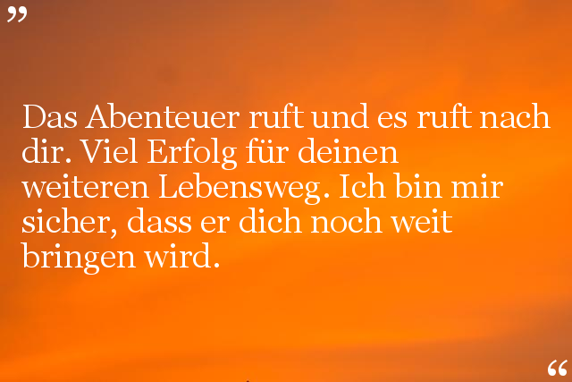 Das Abenteuer ruft und es ruft nach dir. Viel Erfolg für deinen weiteren Lebensweg. Ich bin mir sicher, dass er dich noch weit bringen wird.