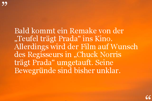 Bald kommt ein Remake von der „Teufel trägt Prada“ ins Kino. Allerdings wird der Film auf Wunsch des Regisseurs in „Chuck Norris trägt Prada“ umgetauft. Seine Bewegründe sind bisher unklar.