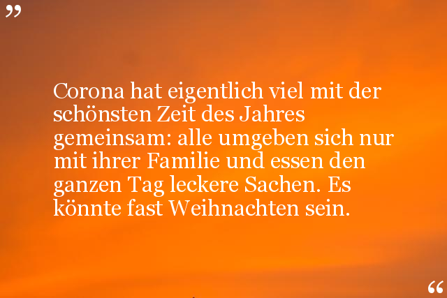 Corona hat eigentlich viel mit der schönsten Zeit des Jahres gemeinsam: alle umgeben sich nur mit ihrer Familie und essen den ganzen Tag leckere Sachen. Es könnte fast Weihnachten sein.