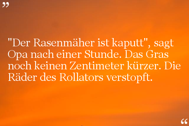 "Der Rasenmäher ist kaputt", sagt Opa nach einer Stunde. Das Gras noch keinen Zentimeter kürzer. Die Räder des Rollators verstopft.