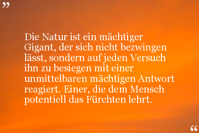 Die Natur ist ein mächtiger Gigant, der sich nicht bezwingen lässt, sondern auf jeden Versuch ihn zu besiegen mit einer unmittelbaren mächtigen Antwort reagiert. Einer, die dem Mensch potentiell das Fürchten lehrt.