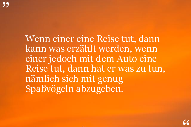 Wenn einer eine Reise tut, dann kann was erzählt werden, wenn einer jedoch mit dem Auto eine Reise tut, dann hat er was zu tun, nämlich sich mit genug Spaßvögeln abzugeben.