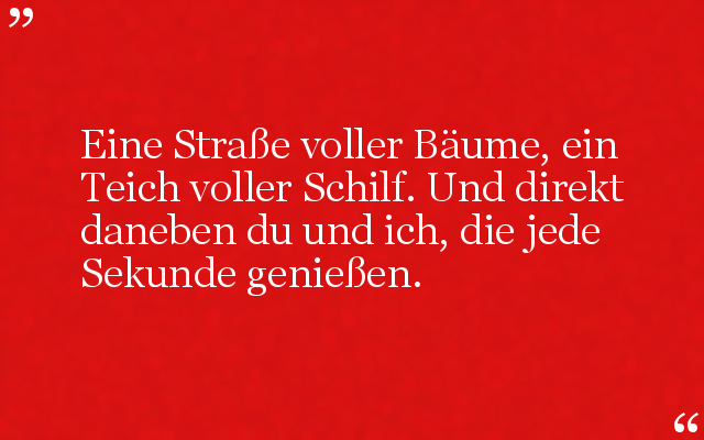 Eine Straße voller Bäume, ein Teich voller Schilf. Und direkt daneben du und ich, die jede Sekunde genießen.