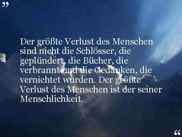 Der größte Verlust des Menschen sind nicht die Schlösser, die geplündert, die Bücher, die verbrannt und die Gedanken, die vernichtet wurden. Der größte Verlust des Menschen ist der seiner Menschlichkeit.