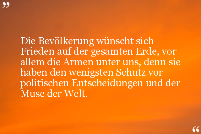 Die Bevölkerung wünscht sich Frieden auf der gesamten Erde, vor allem die Armen unter uns, denn sie haben den wenigsten Schutz vor politischen Entscheidungen und der Muse der Welt.