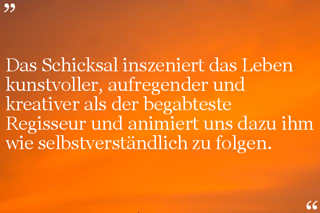 Das Schicksal inszeniert das Leben kunstvoller, aufregender und kreativer als der begabteste Regisseur und animiert uns dazu ihm wie selbstverständlich zu folgen.
