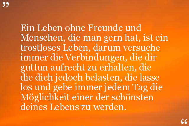 Ein Leben ohne Freunde und Menschen, die man gern hat, ist ein trostloses Leben, darum versuche immer die Verbindungen, die dir guttun aufrecht zu erhalten, die die dich jedoch belasten, die lasse los und gebe immer jedem Tag die Möglichkeit einer der schönsten deines Lebens zu werden.