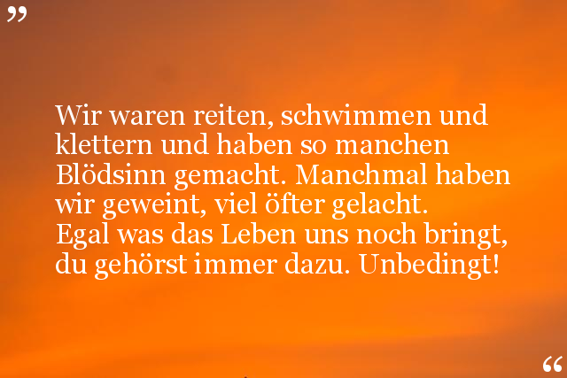 Wir waren reiten, schwimmen und klettern und haben so manchen Blödsinn gemacht. Manchmal haben wir geweint, viel öfter gelacht. Egal was das Leben uns noch bringt, du gehörst immer dazu. Unbedingt!