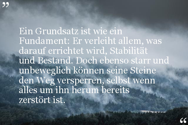 Ein Grundsatz ist wie ein Fundament: Er verleiht allem, was darauf errichtet wird, Stabilität und Bestand. Doch ebenso starr und unbeweglich können seine Steine den Weg versperren, selbst wenn alles um ihn herum bereits zerstört ist.
