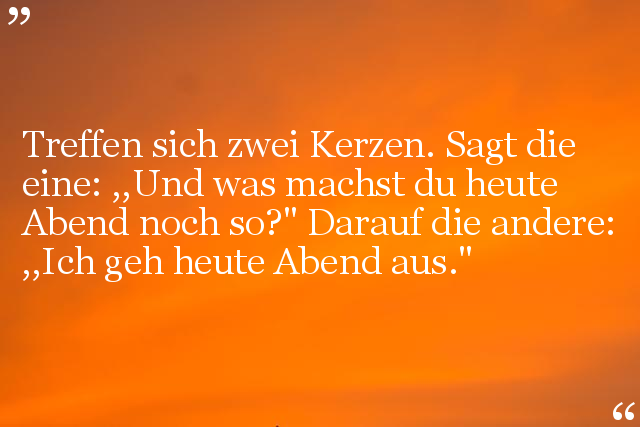 Treffen sich zwei Kerzen. Sagt die eine: ,,Und was machst du heute Abend noch so?" Darauf die andere: ,,Ich geh heute Abend aus."