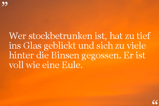 Wer stockbetrunken ist, hat zu tief ins Glas geblickt und sich zu viele hinter die Binsen gegossen. Er ist voll wie eine Eule.