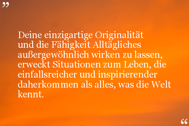 Deine einzigartige Originalität und die Fähigkeit Alltägliches außergewöhnlich wirken zu lassen, erweckt Situationen zum Leben, die einfallsreicher und inspirierender daherkommen als alles, was die Welt kennt.
