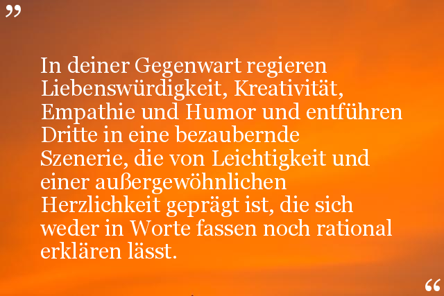 In deiner Gegenwart regieren Liebenswürdigkeit, Kreativität, Empathie und Humor und entführen Dritte in eine bezaubernde Szenerie, die von Leichtigkeit und einer außergewöhnlichen Herzlichkeit geprägt ist, die sich weder in Worte fassen noch rational erklären lässt.
