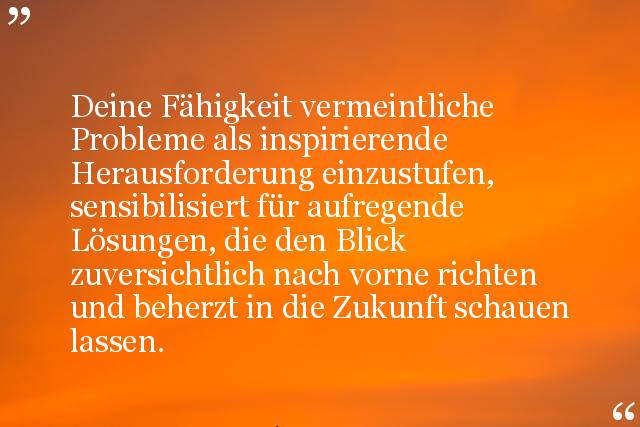 Deine Fähigkeit vermeintliche Probleme als inspirierende Herausforderung einzustufen, sensibilisiert für aufregende Lösungen, die den Blick zuversichtlich nach vorne richten und beherzt in die Zukunft schauen lassen.