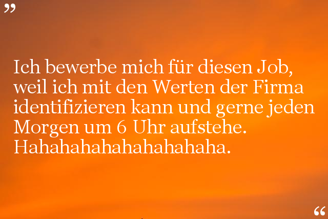 Ich bewerbe mich für diesen Job, weil ich mit den Werten der Firma identifizieren kann und gerne jeden Morgen um 6 Uhr aufstehe. Hahahahahahahahahaha.