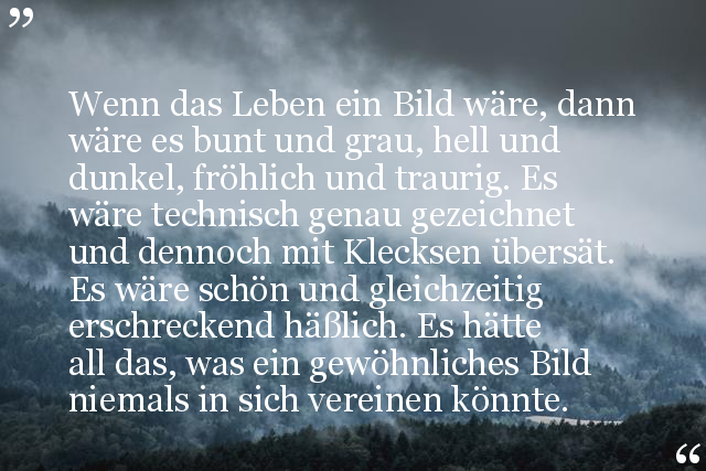 Wenn das Leben ein Bild wäre, dann wäre es bunt und grau, hell und dunkel, fröhlich und traurig. Es wäre technisch genau gezeichnet und dennoch mit Klecksen übersät. Es wäre schön und gleichzeitig erschreckend häßlich. Es hätte all das, was ein gewöhnliches Bild niemals in sich vereinen könnte.
