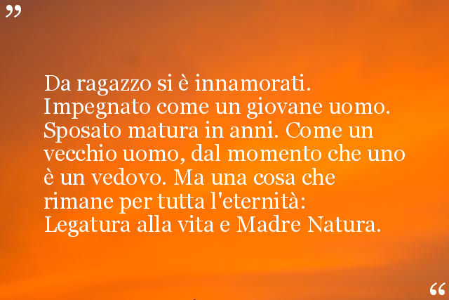 Da ragazzo si è innamorati. Impegnato come un giovane uomo. Sposato matura in anni. Come un vecchio uomo, dal momento che uno è un vedovo. Ma una cosa che rimane per tutta l'eternità: Legatura alla vita e Madre Natura.
