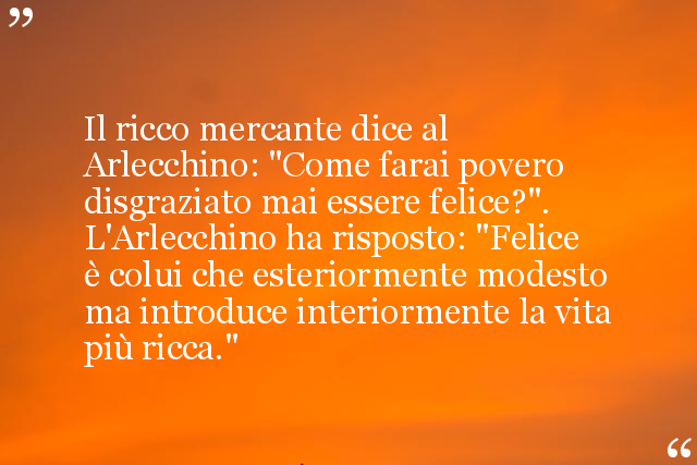 Il ricco mercante dice al Arlecchino: "Come farai povero disgraziato mai essere felice?". L'Arlecchino ha risposto: "Felice è colui che esteriormente modesto ma introduce interiormente la vita più ricca."