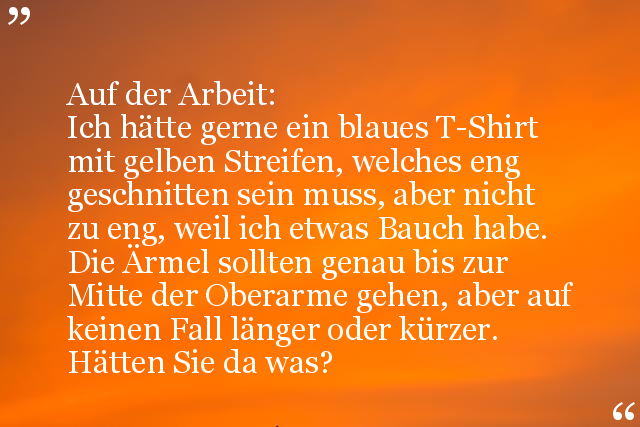 Ich hätte gerne ein blaues T-Shirt mit gelben Streifen, welches eng geschnitten sein muss, aber nicht zu eng, weil ich etwas Bauch habe. Die Ärmel sollten genau bis zur Mitte der Oberarme gehen, aber auf keinen Fall länger oder kürzer. Hätten Sie da was?