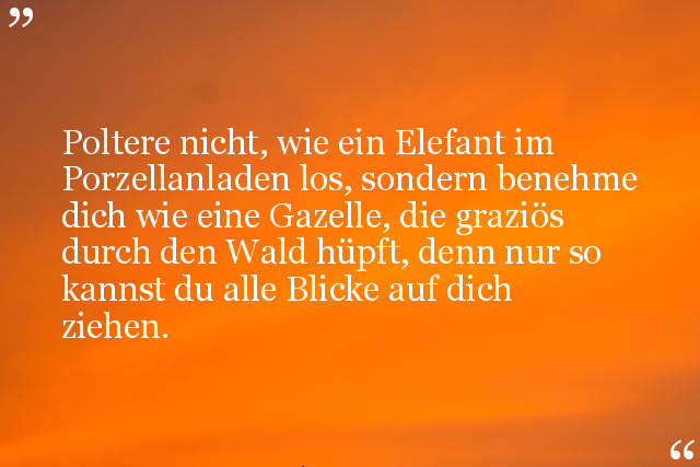 Poltere nicht, wie ein Elefant im Porzellanladen los, sondern benehme dich wie eine Gazelle, die graziös durch den Wald hüpft, denn nur so kannst du alle Blicke auf dich ziehen.