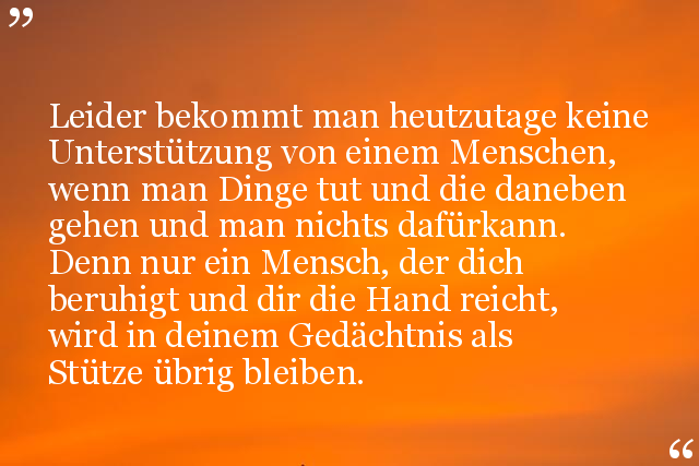 Leider bekommt man heutzutage keine Unterstützung von einem Menschen, wenn man Dinge tut und die daneben gehen und man nichts dafürkann. Denn nur ein Mensch, der dich beruhigt und dir die Hand reicht, wird in deinem Gedächtnis als Stütze übrig bleiben.