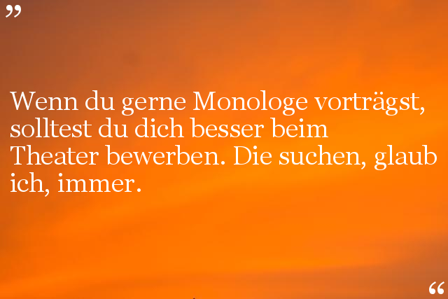 Wenn du gerne Monologe vorträgst, solltest du dich besser beim Theater bewerben. Die suchen, glaub ich, immer.