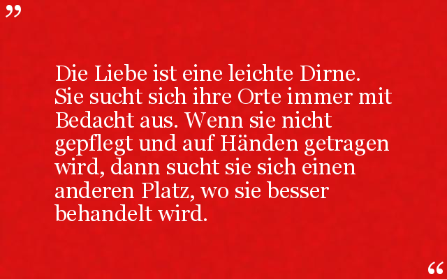 Die Liebe ist eine leichte Dirne. Sie sucht sich ihre Orte immer mit Bedacht aus. Wenn sie nicht gepflegt und auf Händen getragen wird, dann sucht sie sich einen anderen Platz, wo sie besser behandelt wird.