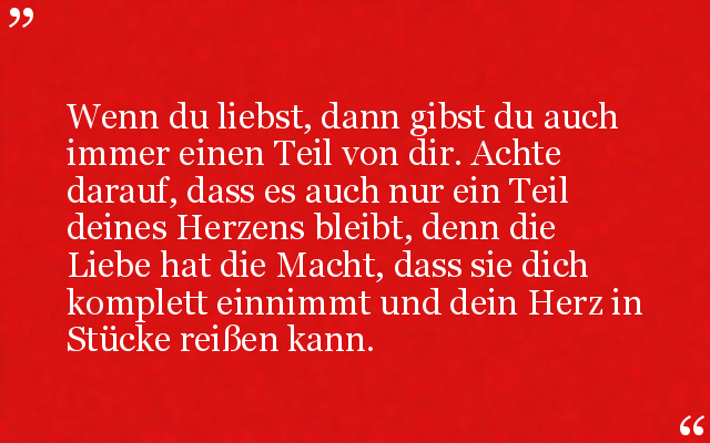 Wenn du liebst, dann gibst du auch immer einen Teil von dir. Achte darauf, dass es auch nur ein Teil deines Herzens bleibt, denn die Liebe hat die Macht, dass sie dich komplett einnimmt und dein Herz in Stücke reißen kann.