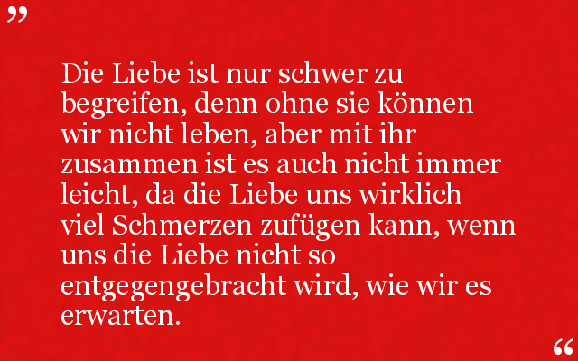 Die Liebe ist nur schwer zu begreifen, denn ohne sie können wir nicht leben, aber mit ihr zusammen ist es auch nicht immer leicht, da die Liebe uns wirklich viel Schmerzen zufügen kann, wenn uns die Liebe nicht so entgegengebracht wird, wie wir es erwarten.