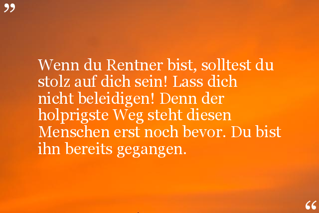 Wenn du Rentner bist, solltest du stolz auf dich sein! Lass dich nicht beleidigen! Denn der holprigste Weg steht diesen Menschen erst noch bevor. Du bist ihn bereits gegangen.